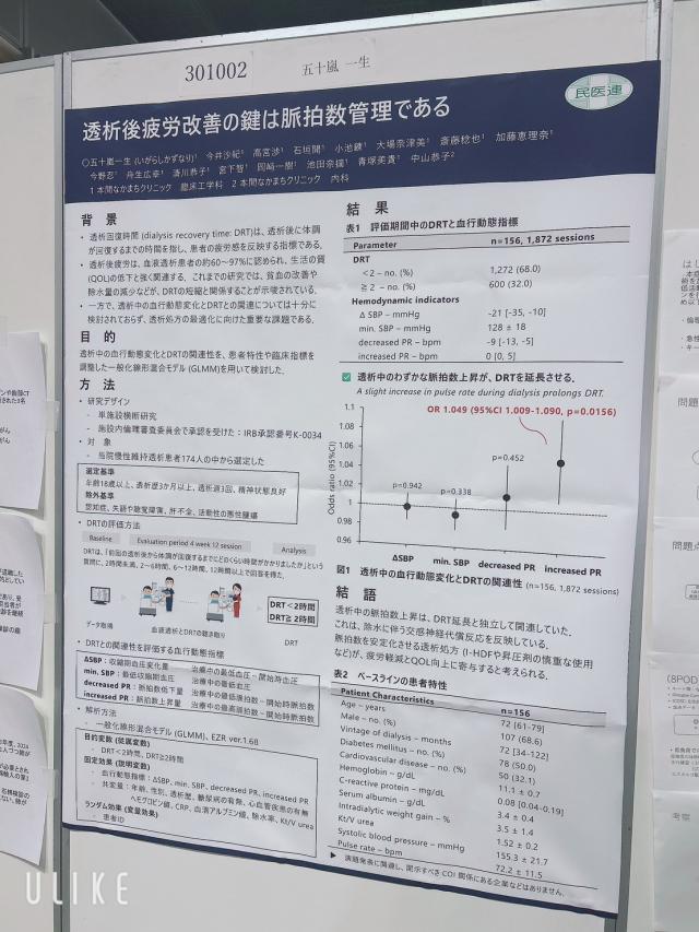 臨床工学科の五十嵐一生は一般演題ポスターで「透析後疲労改善の鍵は脈拍数管理である」について発表しました。