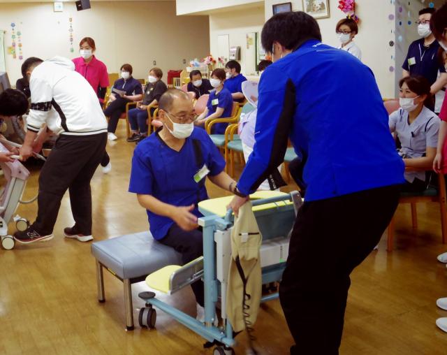 実際に体験し、「腰を固定されているから安心感がある」「移動介助する方も手技が簡単で腰に負担がない」などの意見が聞かれ、質問も多く有意義な研修会となりました。