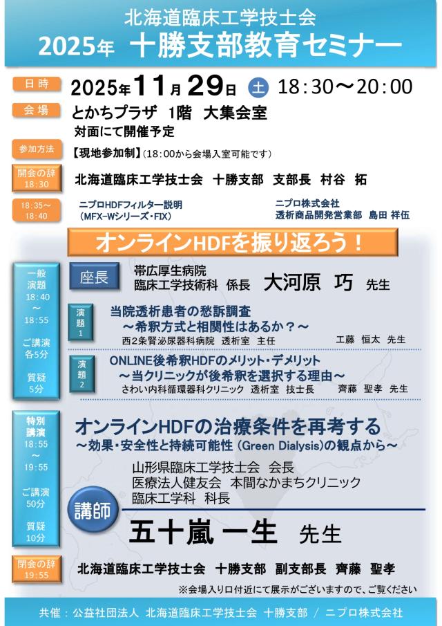 2025年11月29日 (土)にとかちプラザで十勝支部教育セミナーが開催され、臨床工学科の五十嵐一生が参加しました。