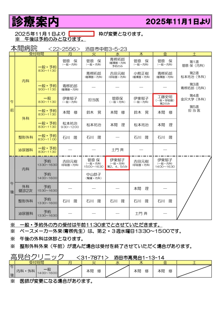 - 担当医が手術や学会出席等のため休診となる場合があります。